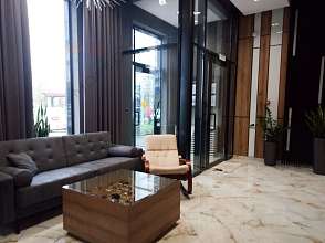 Стильная входная группа с диваном, зоной ожидания и библиотекой для гостей.