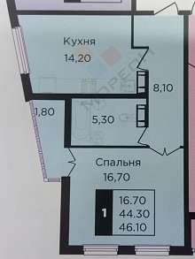 Общая площадь 46,1 м.кв. (с учетом лоджии):