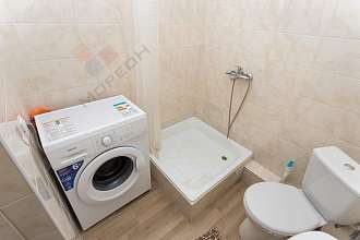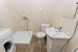 Санузел в кафеле. Установлена стиральная машинка, холодильник.
