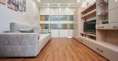 - На кухне, в прихожей и в ванной комнате - плитка, в комнате на полу уложен влагостойкий качественный ламинат 33 класса;