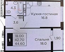 Площадь квартиры составляет 44.60 кв.м., что позволяет разместиться комфортно и создать уютное пространство для жизни.