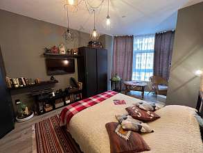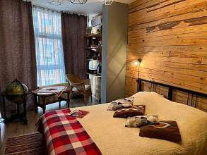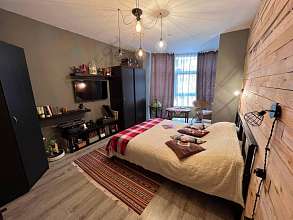 - Основная спальня с витражным остеклением, одна стена обшита натуральным деревом, стиль лофт, освещение и розетки в стиле лофт, можно зонировать ширмой