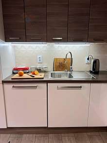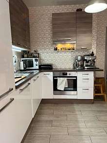 - Техника: встроенный холодильник, посудомоечная машина, духовой шкаф, варочная плита, вытяжка, микроволновка