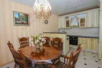 Кухня-столовая зонирована с помощью потолочного освещения и кухонного острова на две части: зону приготовления и обеденную зону. Кухонный остров двусторонний: со стороны рабочей зоны глухая система хранения, с обеденной стороны - стеклянные витражи. Кухонная зона оформлена белым дубовым гарнитуром с патиной и со встроенной итальянской техникой (варочная индукционная поверхность, духовой шкаф, посудомоечная машина, холодильник, вытяжка), свч-печь, чайник, кухонный комбайн. В зоне столовой мебель из массива гивеи.