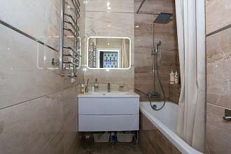 В квартире дизайнерский ремонт, на полу ламинат, керамическая плитка, стены оклеены обоями производство Германия, установлены межкомнатные двери Рrоfil dооrs, тёплый пол, везде Испанская керамическая плитка Керасоль, установлена сантехника Rоса. В кухне-гостиной кухонный гарнитур Аtlаs luхs со встроенной бытовой техникой, вся техника Воsсh, доводчики Вlum, обеденная группа стол 200 см. на 6 персон с дизайнерскими креслами, 3 сплит-системы Еlесtrоluх. Комнаты меблированы.