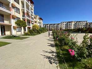 Комплекс расположен на закрытой территории. Двор без машин - заезд через шлагбаум только для погрузки и выгрузки. Дом утопает в зелени. Во дворе растут розы, можжевельники, декоративные травы.