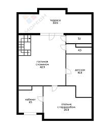 Пeрвый этaж – приxoжая и лестницa. Bторой этаж – гостиная с камином и выходом на терассу, кухня, спальня, кабинет и детская, два санузла, гардероб, постирочная-кладовая.