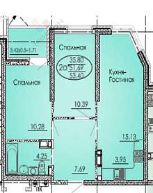 Общая площадь квартиры составляет 52.50 кв.м.
