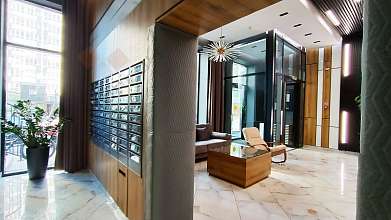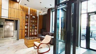 Стильная входная группа с диваном, зоной ожидания и библиотекой для гостей.