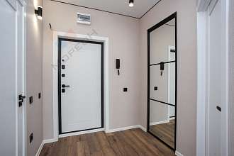 Полноценная гардеробная с распашной зеркальной дверью, которая открывается и внутрь, и наружу.