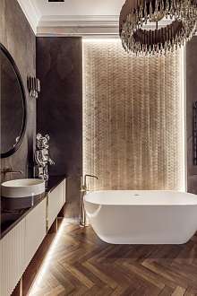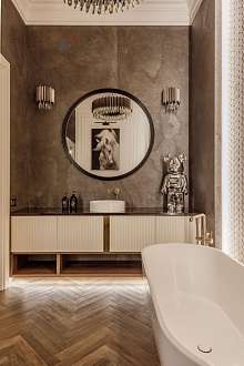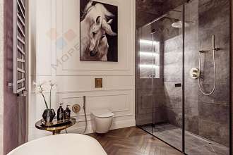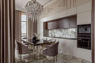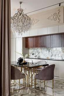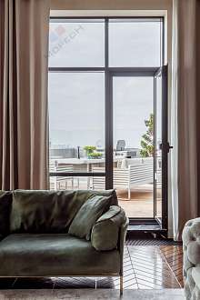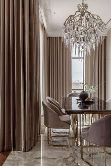 В гостиной и в спальне мягкая корпусная мебель. Шторы с электроприводом. Все люстры дизайнерские, выполнены под заказ. Установлены сплит-системы Mitsubishi. Внутрипольные конвекторы.