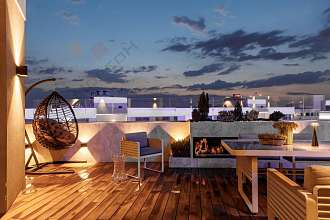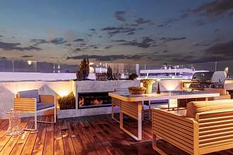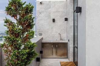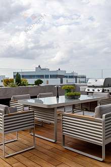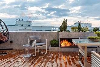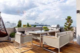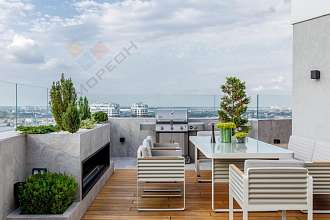 На террасе покрытие из натурального тика, в которой расположена зона отдыха с потрясающий видом на город.