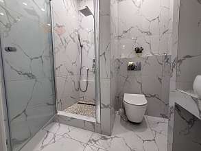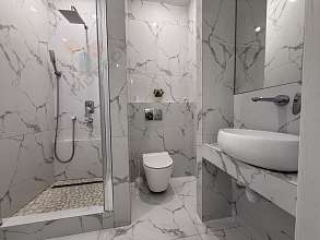 Стильный санузел в кафеле с душевой кабиной и инсталляцией