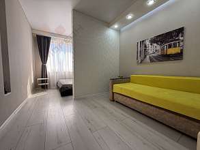 В комнате зона для отдыха и спальная зона