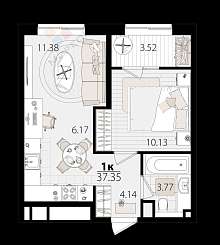 Однокомнатная квартира 18-этажного дома с площадью 37.10 кв.м.